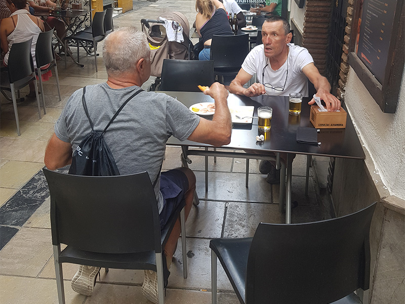 | Tutti i giorni, all'arrivo di tappa, dopo avere sbrigato le solite faccende (manutenzione bici, doccia, bucato, ...) ci si ritrovava davanti a qualche birra per pianificare con precisione l'itinerario del giorno seguente. Ovviamente anche a Baza si è fatta la stessa cosa, in particolare si trattava di definire il percorso più diretto per Granada. |