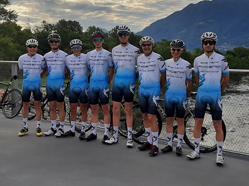 | Nessuna foto di gruppo sul Mortirolo, le prime gocce di pioggia invitano le varie "Fenici" arrivate in cima alla spicciolata ad affrontare immediatamente la discesa. |