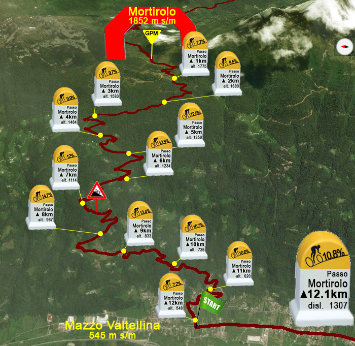 | del Mortirolo (lunghezza 12.1 km, dislivello di 1307 metri e una pendenza media del 10.8% con punte massime al 16%). |