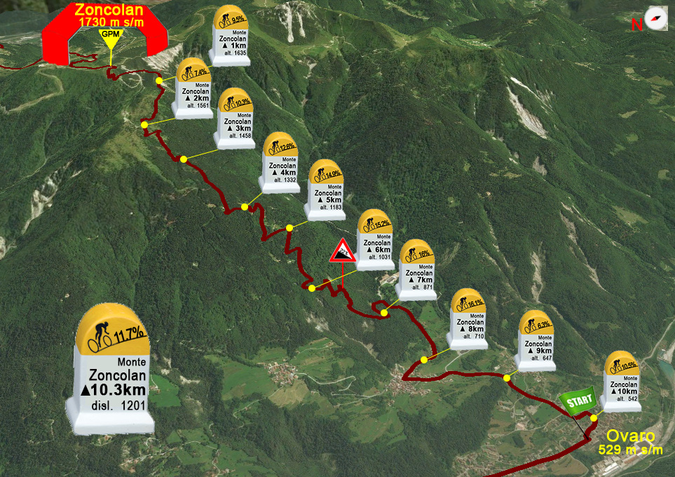 | La tappa dello Zoncolan, 10,3 km per un dislivello di 1201 metri, pendenza media 11.7%, massima 22%. Uno sforzo estremo per quasi 2 ore!! |