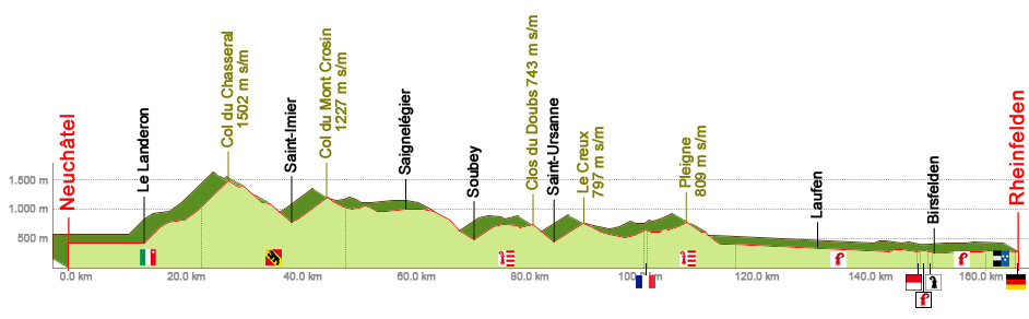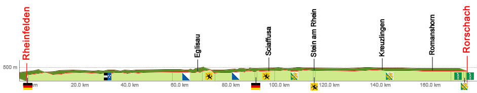 | Lunga tappa piatta (oltre 180 km), anche se alla fine saranno più di mille i metri di dislivello, caratterizzata dal suggestivo passaggio a Sciaffusa con le sue cascate e la sua fortezza (Munot). |